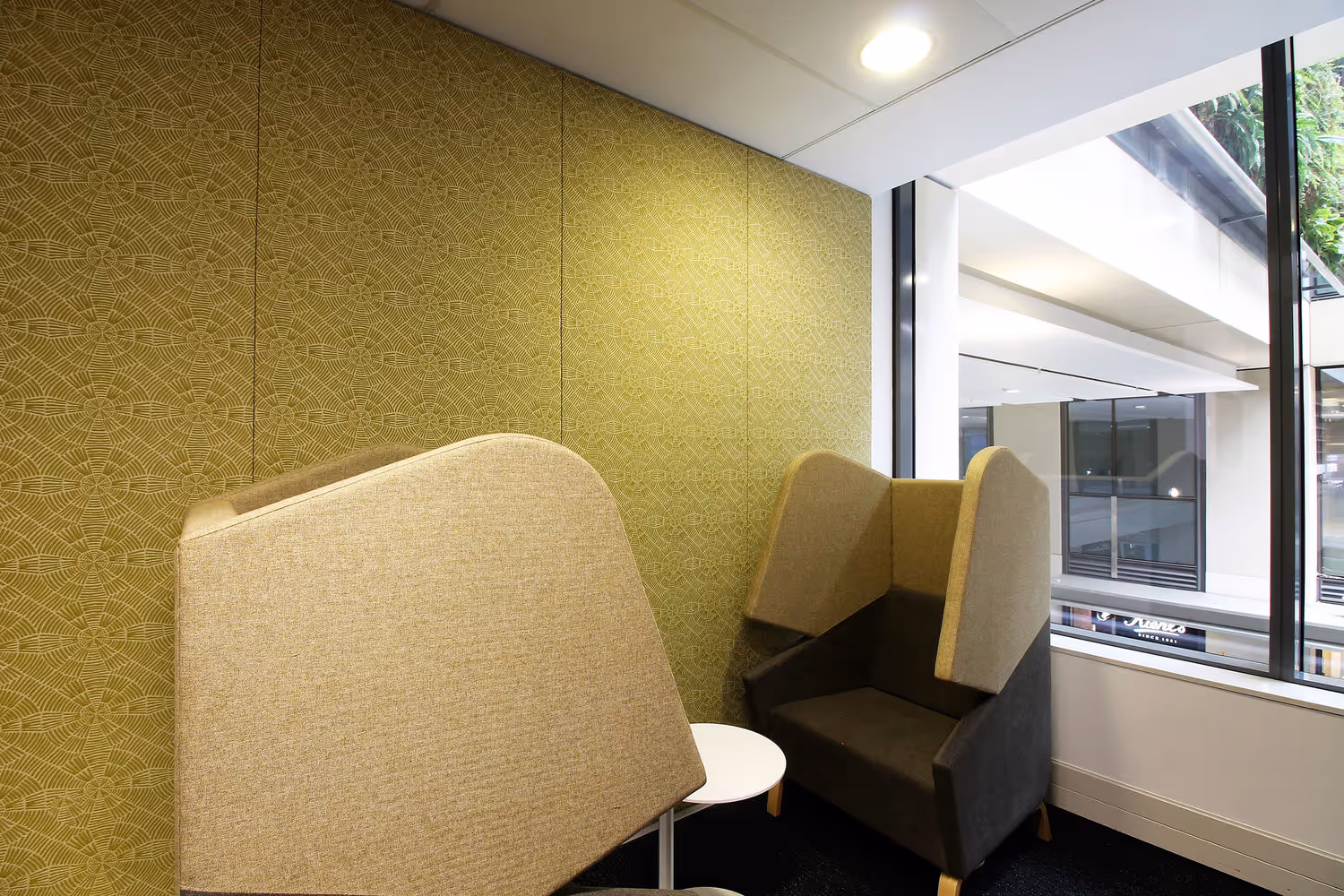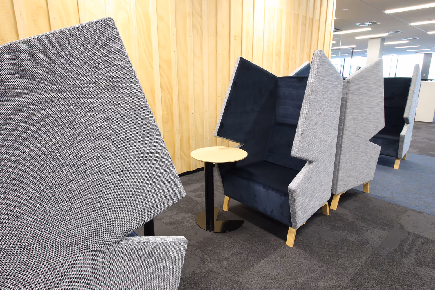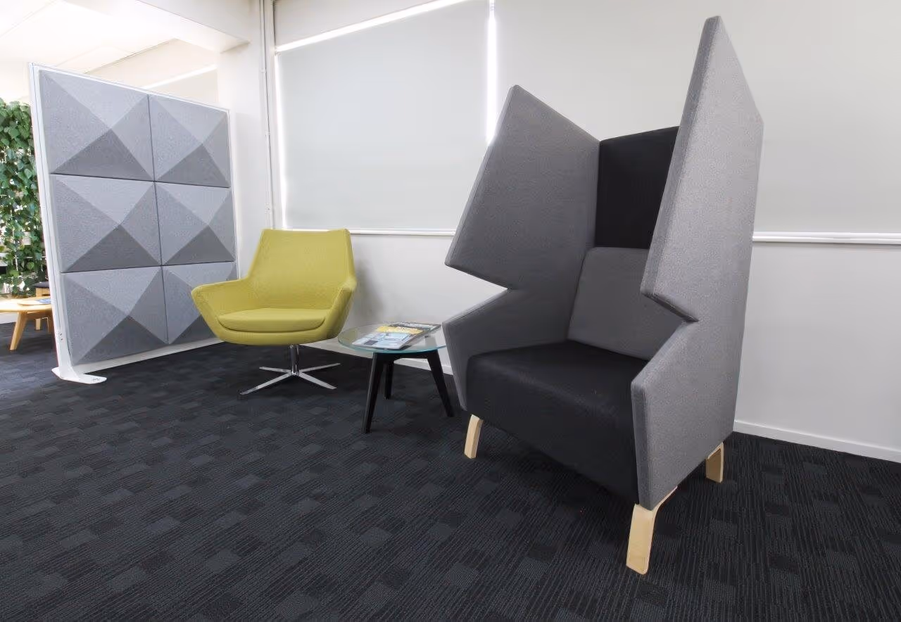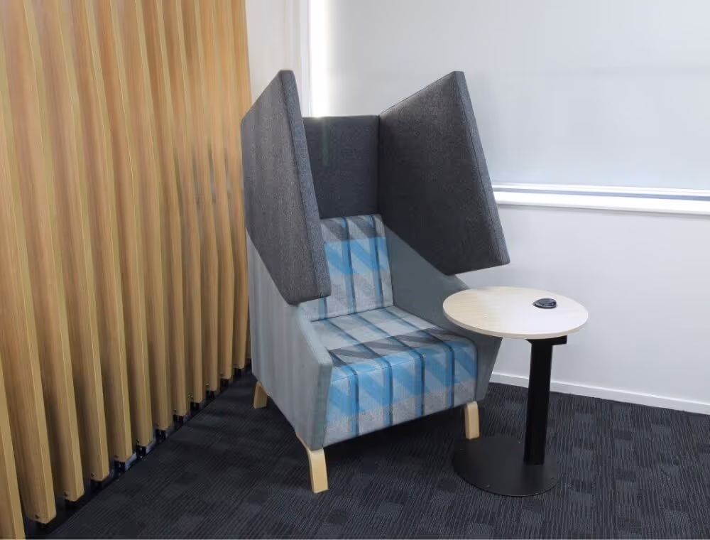 Her modern yet functional shape and acoustic panelling was inspired by Pacman himself, and she provides a screen to block out interfering noise while containing and directing your voice towards whomever you are meeting with.